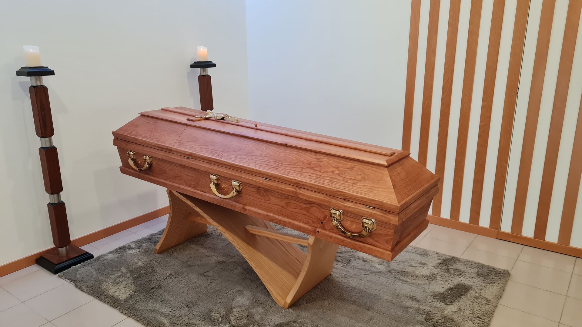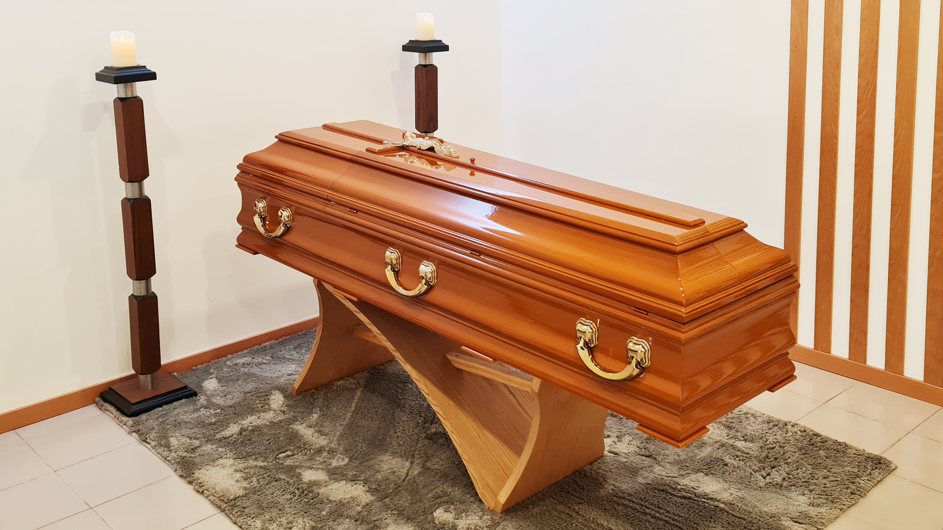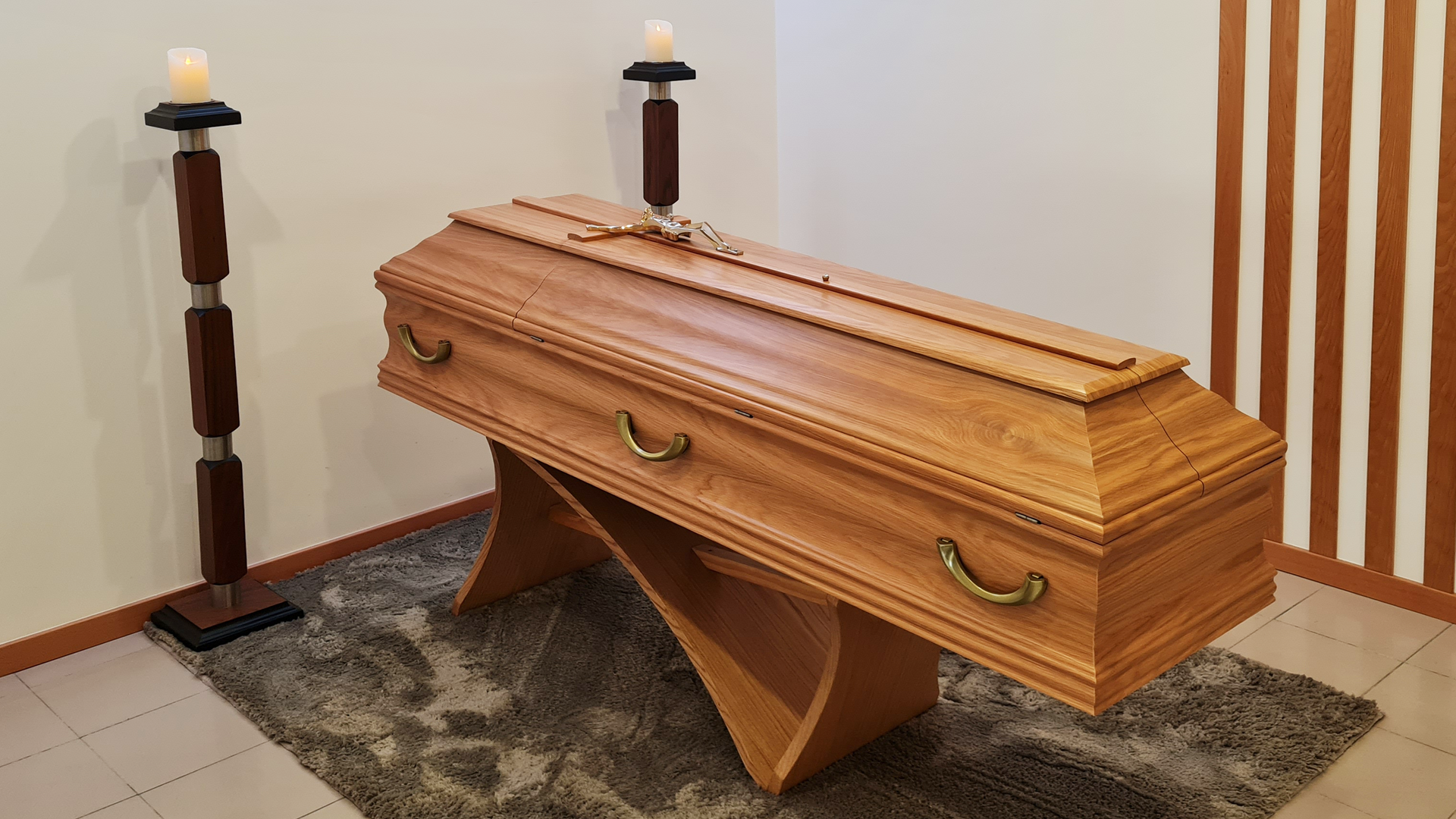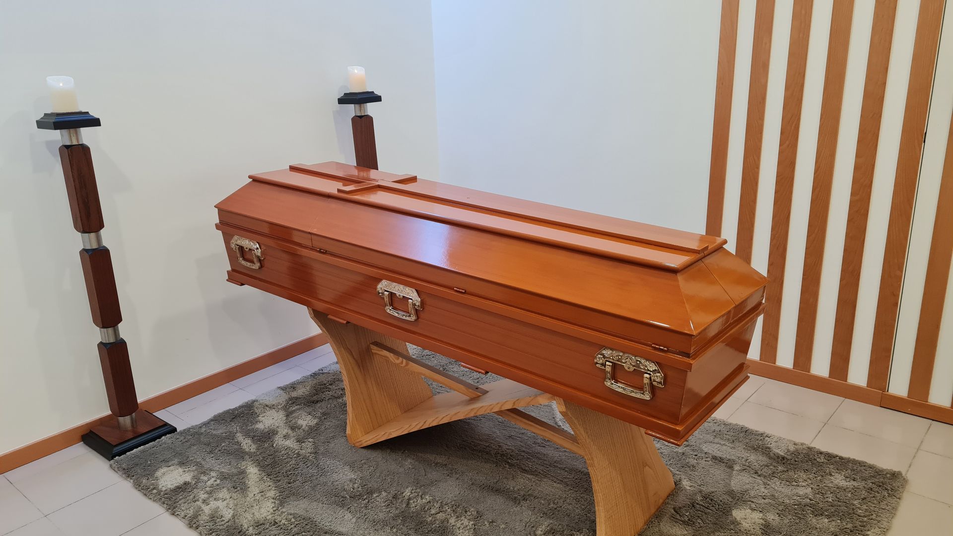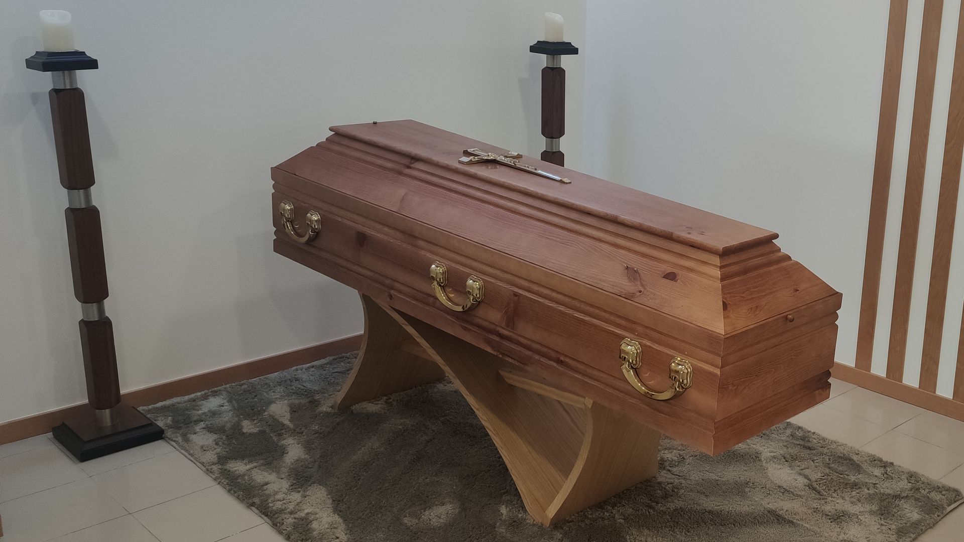 Características gerais: Urna lisa em pinho mel com meia cana e opção de gravação
